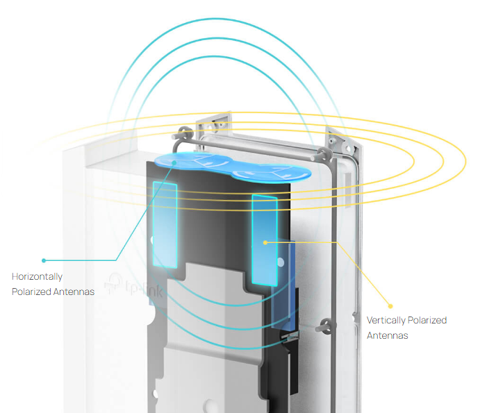 TP-Link Smart Antenna technology brings lower interference, longer coverage, and higher performance. EAP650-Outdoor is equipped with horizontally polarized antennas and vertically polarized antennas, while its intelligent algorithms automatically select the optimal antennas to ensure the peak WiFi experience ideal for outdoor applications.