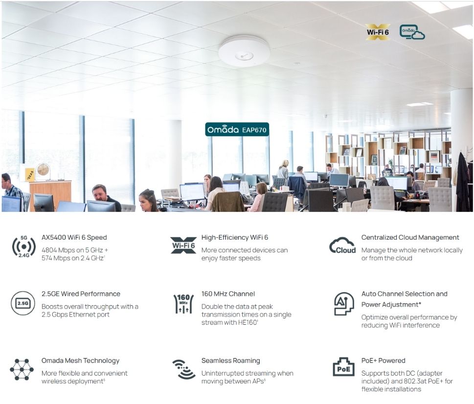 - TP-Link EAP670 AX5400 Ceiling Mount WiFi 6 Access Point | PoE+ Powered, 160 MHz Channel, 2.5GE Port TP-Link EAP670 AX5400 Ceiling Mount WiFi 6 Access Point | PoE+ Powered, 160 MHz Channel, 2.5GE Port
