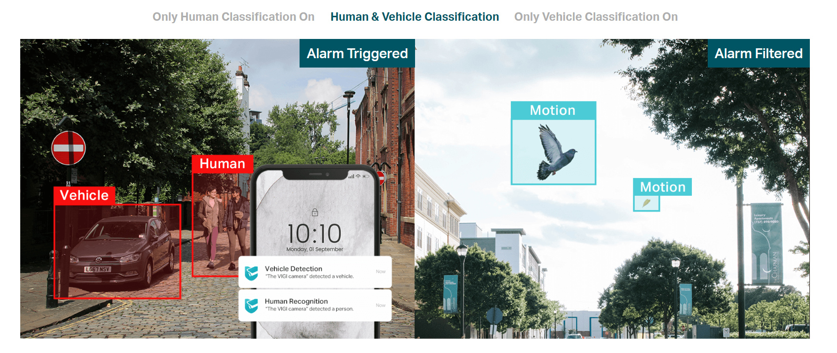 - Human & Vehicle Classification: Distinguishes humans and vehicles from other objects, so you receive more accurate event notifications.