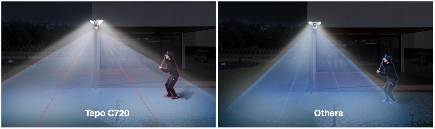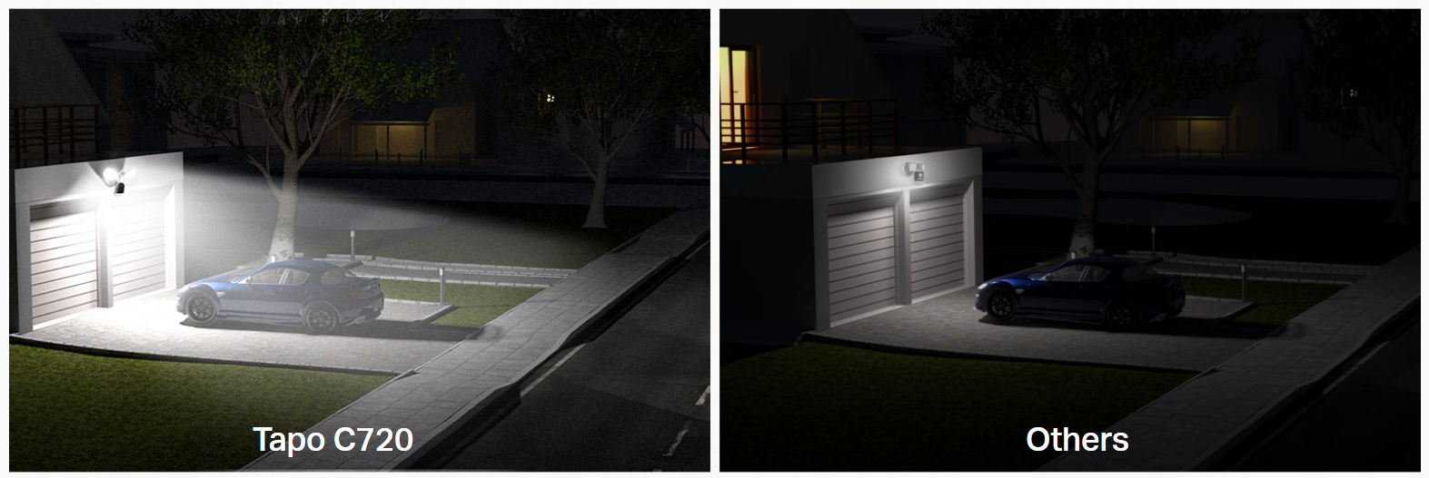 - 2800-Lumen Ultra-Bright Floodlight: Tapo C720's powerful, fully adjustable floodlight and color night vision sees up to 30 feet away, so you can sleep soundly knowing your surroundings are safe.