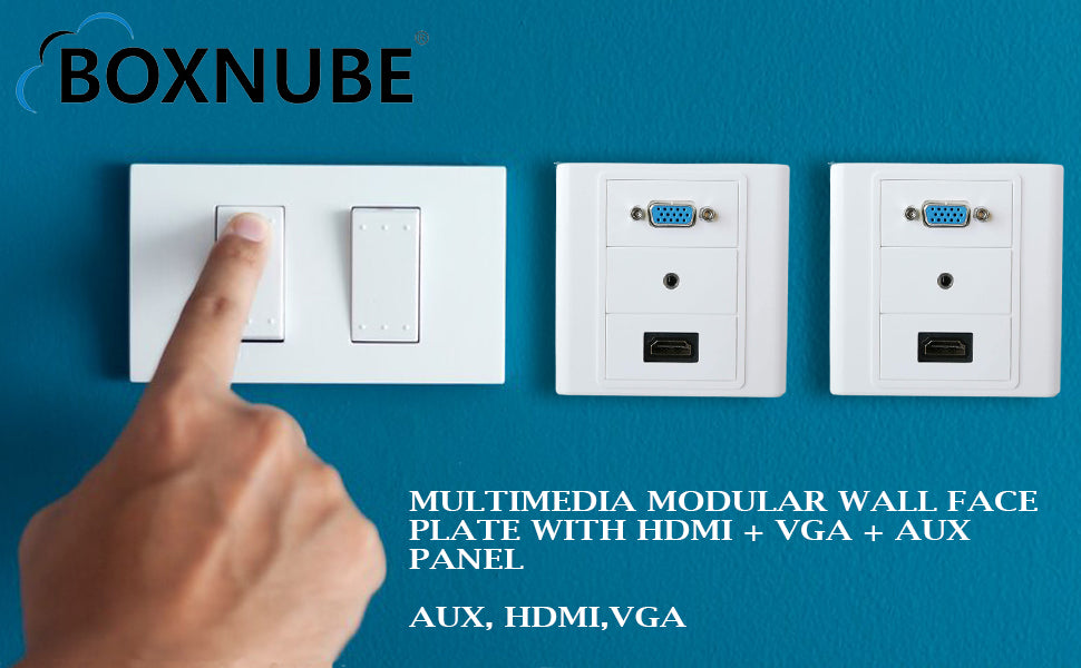 - BOXNUBE Multimedia AV Modular Wall Face Plate with HDMI + VGA + AUX Panel Sockets - White BOXNUBE Multimedia AV Modular Wall Face Plate with HDMI + VGA + AUX Panel Sockets - White