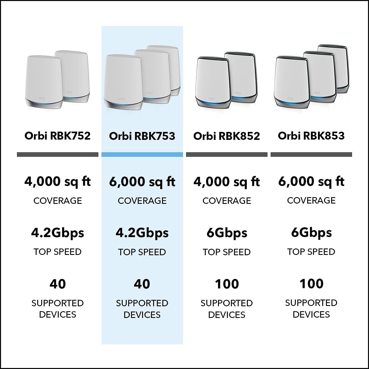 - Netgear AX4200 WiFi Mesh System (RBK753) Orbi Tri-Band WiFi 6 Mesh System, 4.2Gbps, Router + 2 Satellites Netgear AX4200 WiFi Mesh System (RBK753) Orbi Tri-Band WiFi 6 Mesh System, 4.2Gbps, Router + 2 Satellites