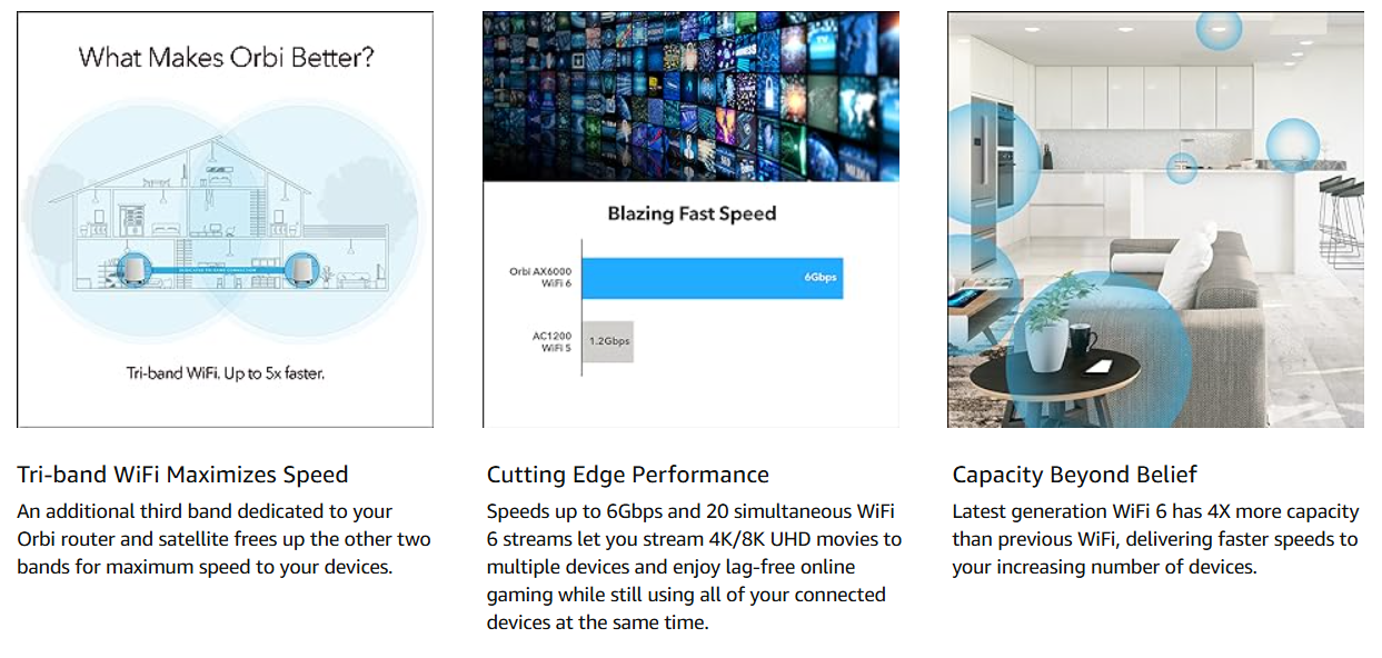 - 2.4 Gbps (1200Mbps) dedicated WiFi link for faster data connections between OrbiRouter and Orbi Satellite