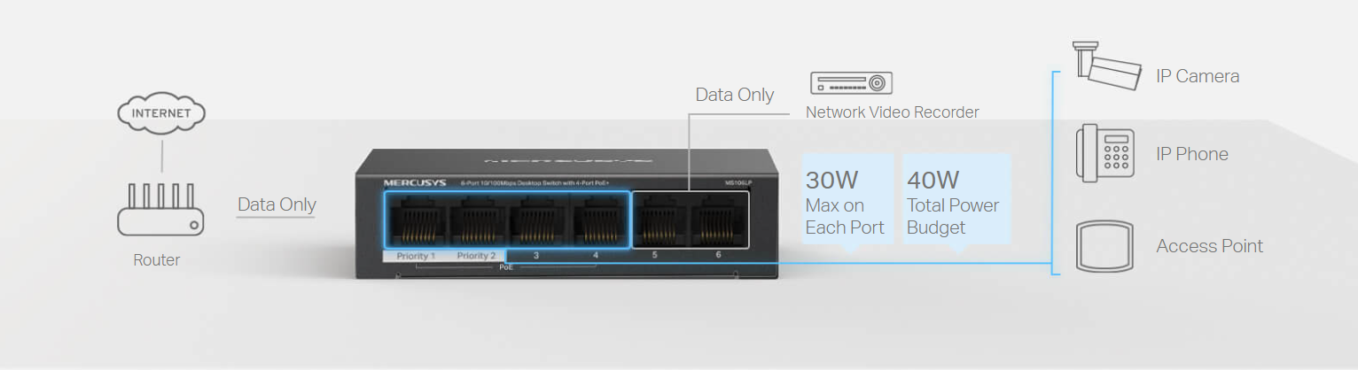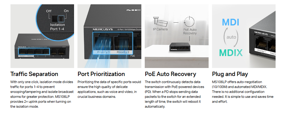 - Mercusys MS106LP 6-Port 10/100Mbps Desktop Switch with 4-Port PoE+ Mercusys MS106LP 6-Port 10/100Mbps Desktop Switch with 4-Port PoE+