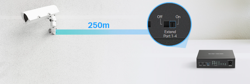 - Long-Range up to 250 m: Increases PoE transmission distance to 250 m by Extend Mode*