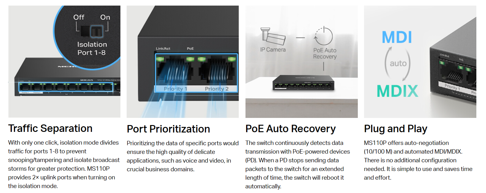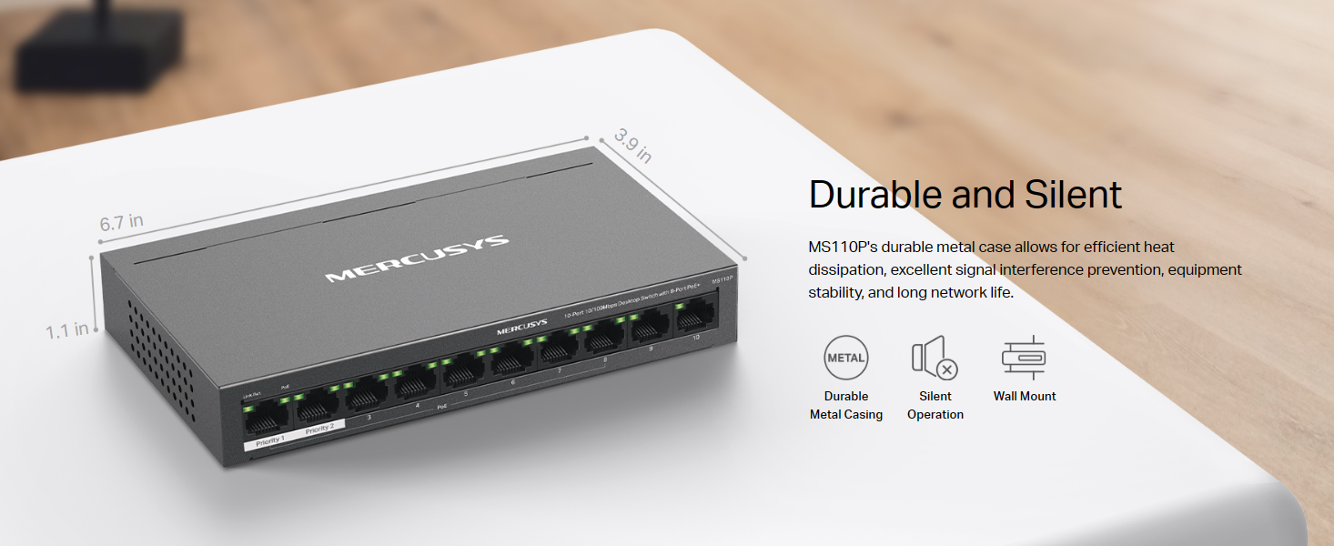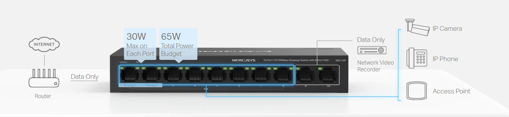 - Mercusys MS110P 10-Port 10/100Mbps Desktop Switch with 8-Port PoE+ Mercusys MS110P 10-Port 10/100Mbps Desktop Switch with 8-Port PoE+