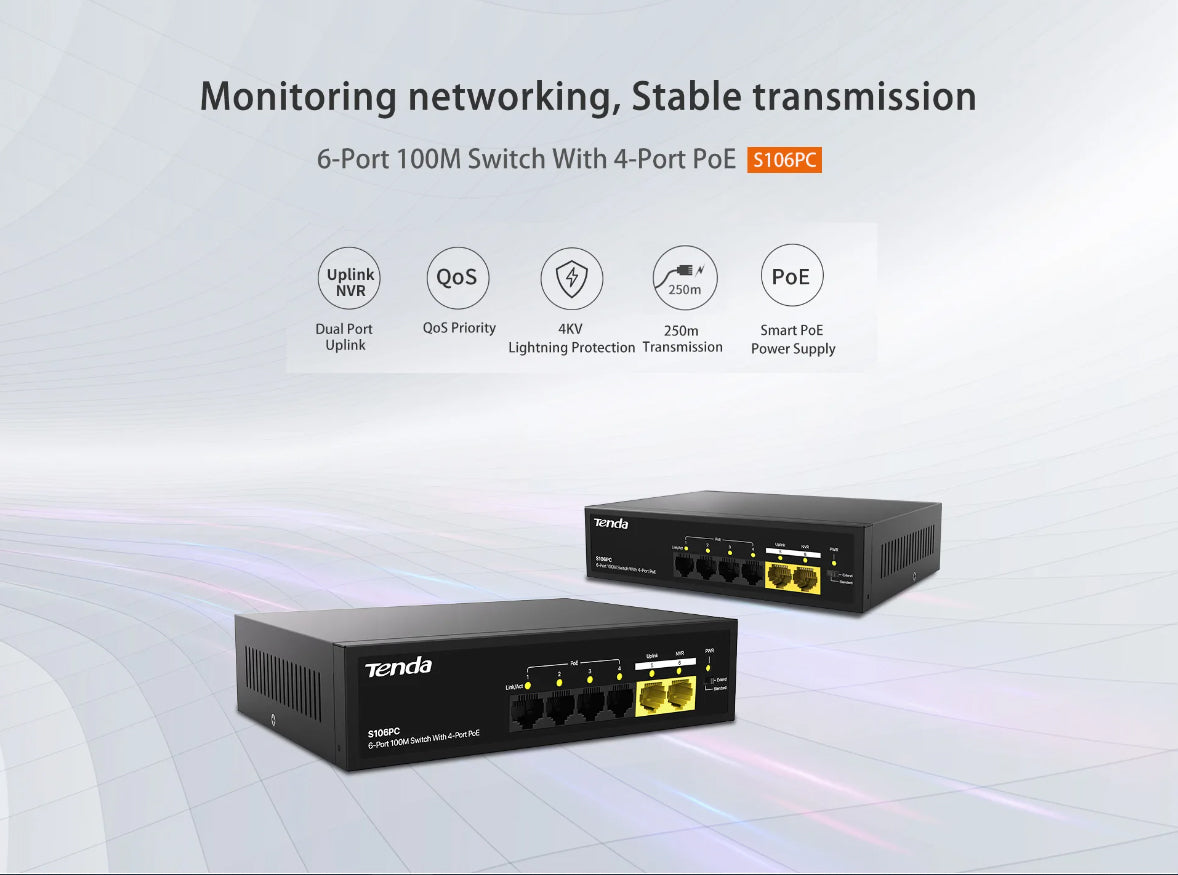 - Tenda S106PC 6-Port 100M Lite PoE Switch with 4-Port PoE | 55W PoE Budget | Desktop / Wall Mounting Supported | 4KV lighting protection Tenda S106PC 6-Port 100M Lite PoE Switch with 4-Port PoE | 55W PoE Budget | Desktop / Wall Mounting Supported | 4KV lighting protection