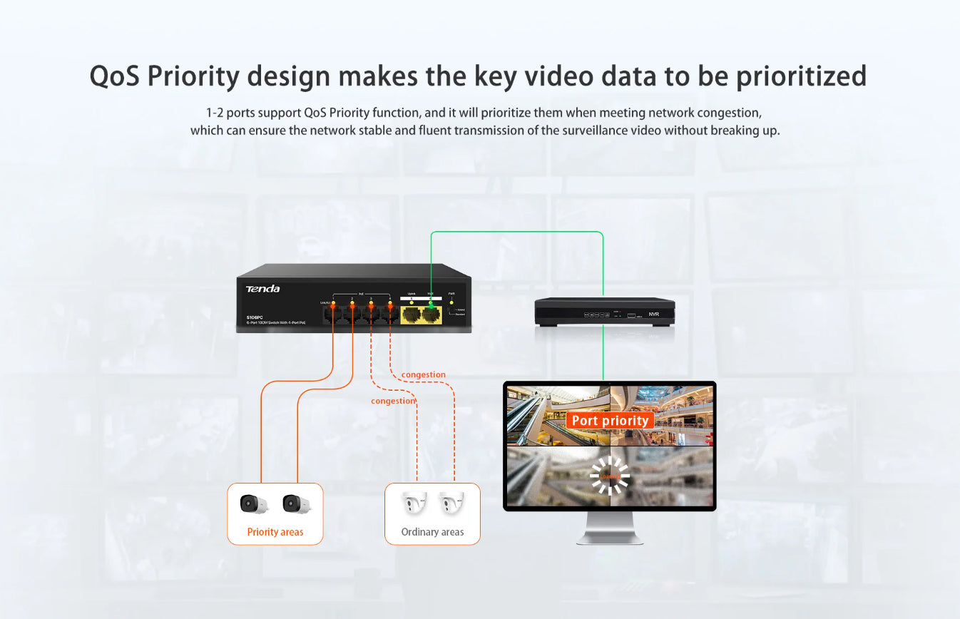 S106PC is a 100M dual-port uplink unmanaged PoE switch independently designed by Tenda. Compatible with AF/AT standard PoE power supply mode, intelligently identify powered devices. The maximum output of a single port is 30W, and that of the whole machine is 55W. Support 250m network extension, QoS priority and other functions, designed for outdoor, indoor, etc.Small-scale monitoring network needs to be built, it is an ideal choice for small enterprises, convenience stores, and street restaurants video surveillance network.