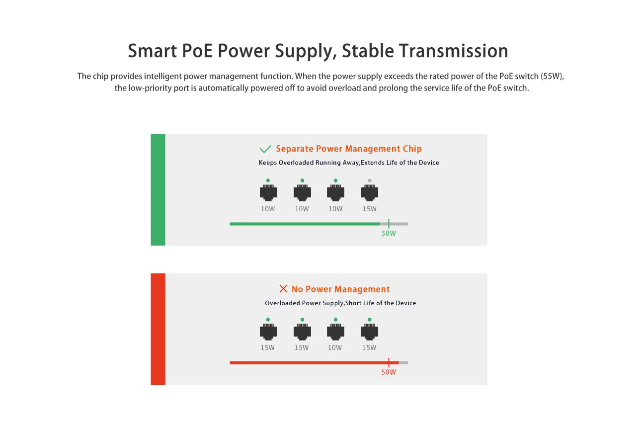 - 55W PoE Budget, One-Key VLAN