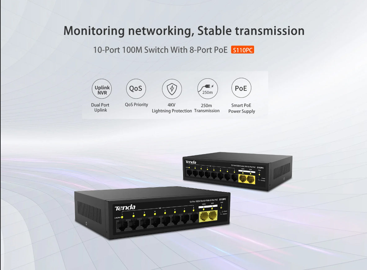 - Tenda S110PC 10-Port 100M Lite PoE Switch with 8-Port PoE | 80W PoE Budget | Desktop / Wall Mounting Supported | 4KV lighting protection Tenda S110PC 10-Port 100M Lite PoE Switch with 8-Port PoE | 80W PoE Budget | Desktop / Wall Mounting Supported | 4KV lighting protection