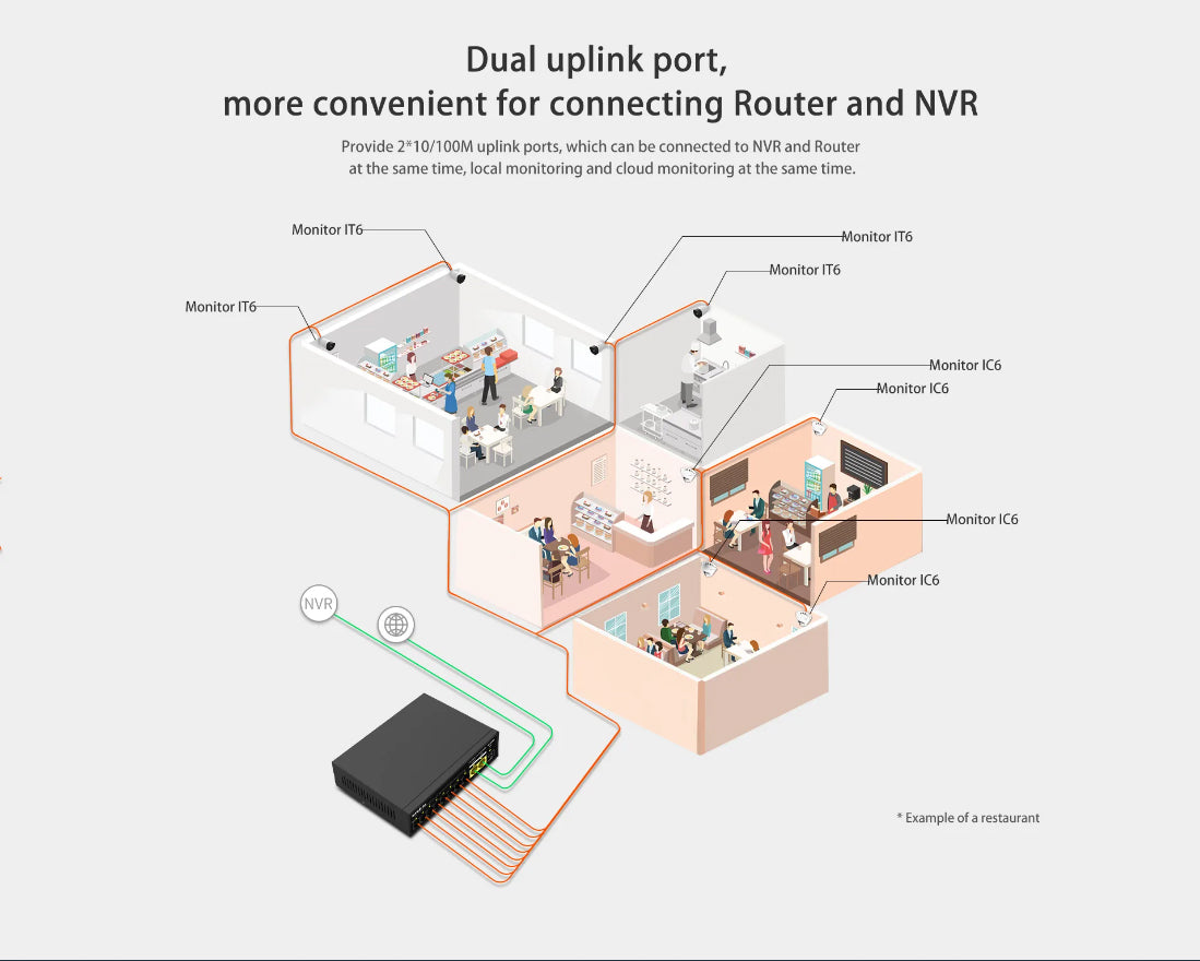 Provide 2 x 10/100M uplink ports, which can be connected to NVR and router at the same time, local monitoring and cloud monitoring at the same time.