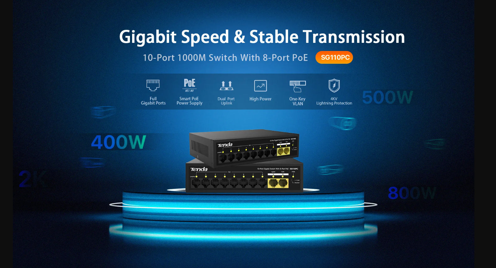 - Tenda SG110PC 10-Port Gigabit Lite PoE Switch with 8-Port PoE | 100W PoE Budget | Desktop / Wall Mounting Supported | 4KV lighting protection Tenda SG110PC 10-Port Gigabit Lite PoE Switch with 8-Port PoE | 100W PoE Budget | Desktop / Wall Mounting Supported | 4KV lighting protection
