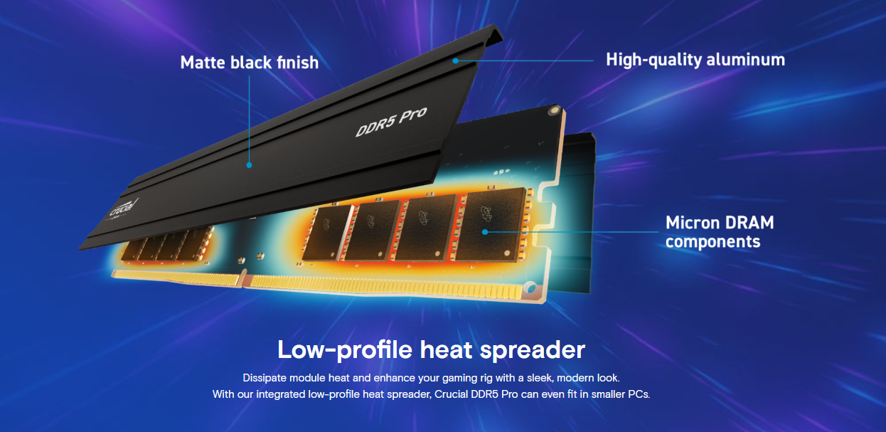 Crucial® DDR5 Pro Memory has the blazing speed and massive bandwidth needed to support next-gen multi-core CPUs without the fuss of overclocking, latency tuning, die chasing, and LEDs.