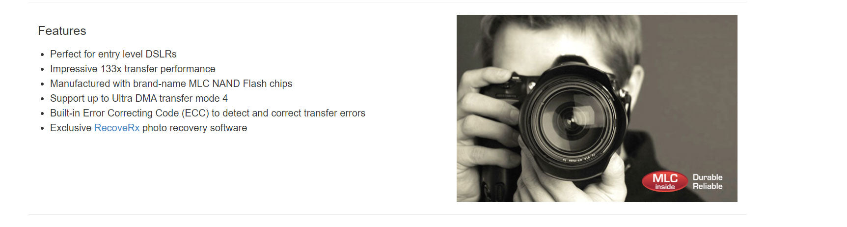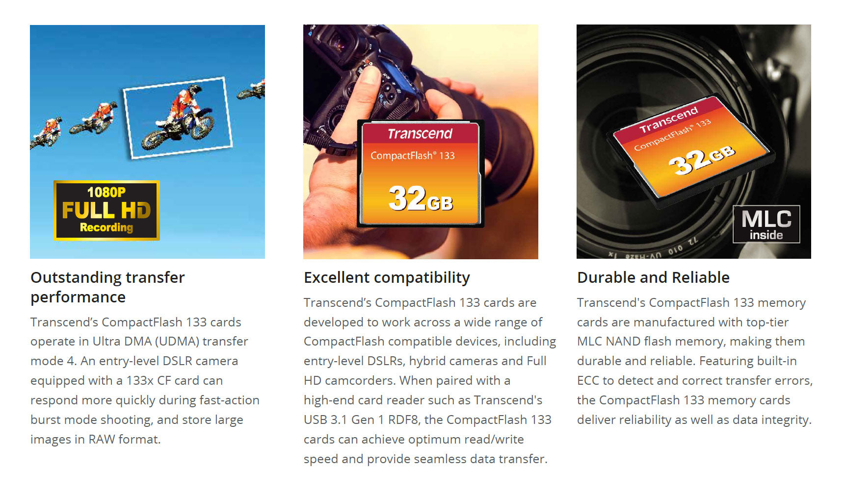 Fast, reliable, and high-capacity. With consistent performance and vast storage capacity, Transcend's CompactFlash 133 cards are the perfect match for enthusiast and prosumer level DSLR cameras and camcorders. Additionally, the top-tier MLC NAND flash chips inside are durable and reliable.