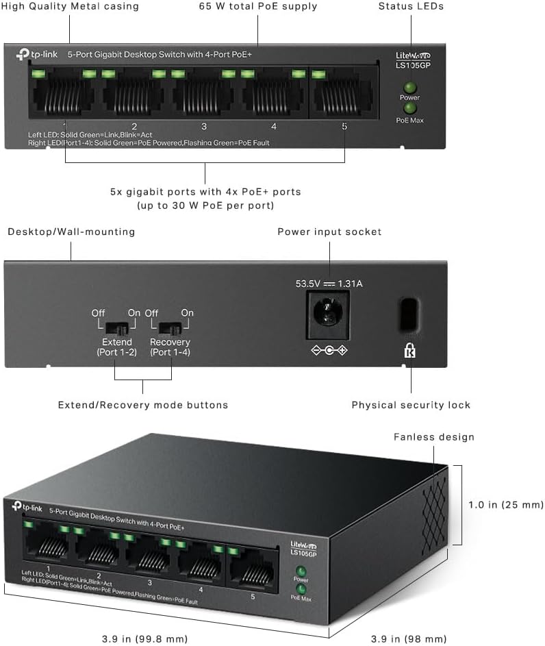 - TP-Link LS105GP 5-Port Gigabit Desktop Switch with 4-Port PoE+ | 65W 250M with Extend Mode TP-Link LS105GP 5-Port Gigabit Desktop Switch with 4-Port PoE+ | 65W 250M with Extend Mode