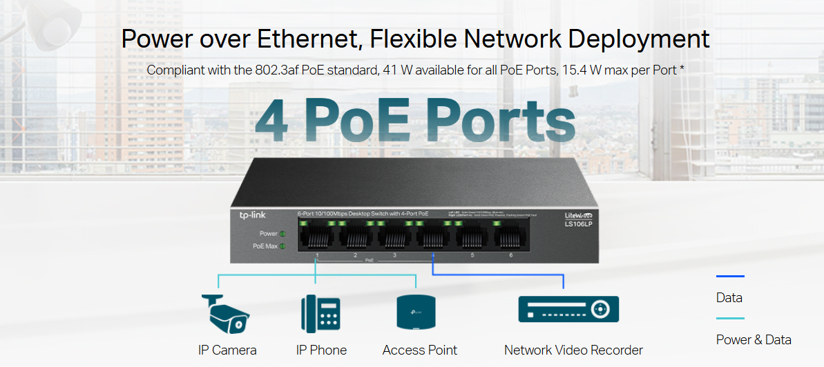 41 W PoE Budget: Four 10/100 Mbps 802.3af-compliant PoE ports easily connect and power fixed devices like IP cameras, access points, and IP phones via a single cable. Up to 15.4 W PoE output is supported by each PoE port.*