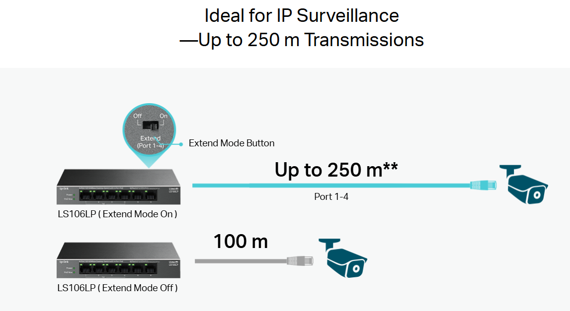 Up to 250 m PoE Transmission: With Extend Mode, PoE transmission distance reaches up to 250m, perfect for surveillance camera deployment in large areas.**