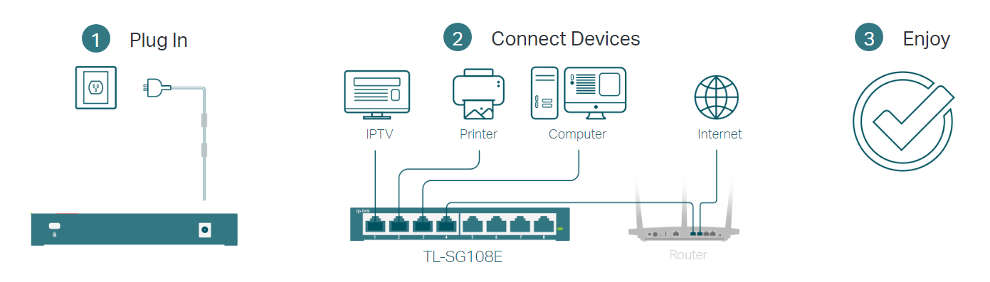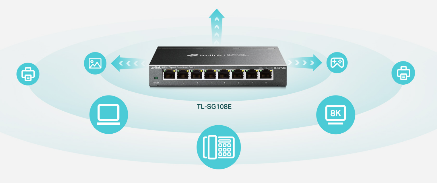 - TP-LINK TL-SG108E 8 Port Gigabit Smart Switch | Metal Casing, Fanless | 16 Gbps Switching Capacity, L2 Features TP-LINK TL-SG108E 8 Port Gigabit Smart Switch | Metal Casing, Fanless | 16 Gbps Switching Capacity, L2 Features